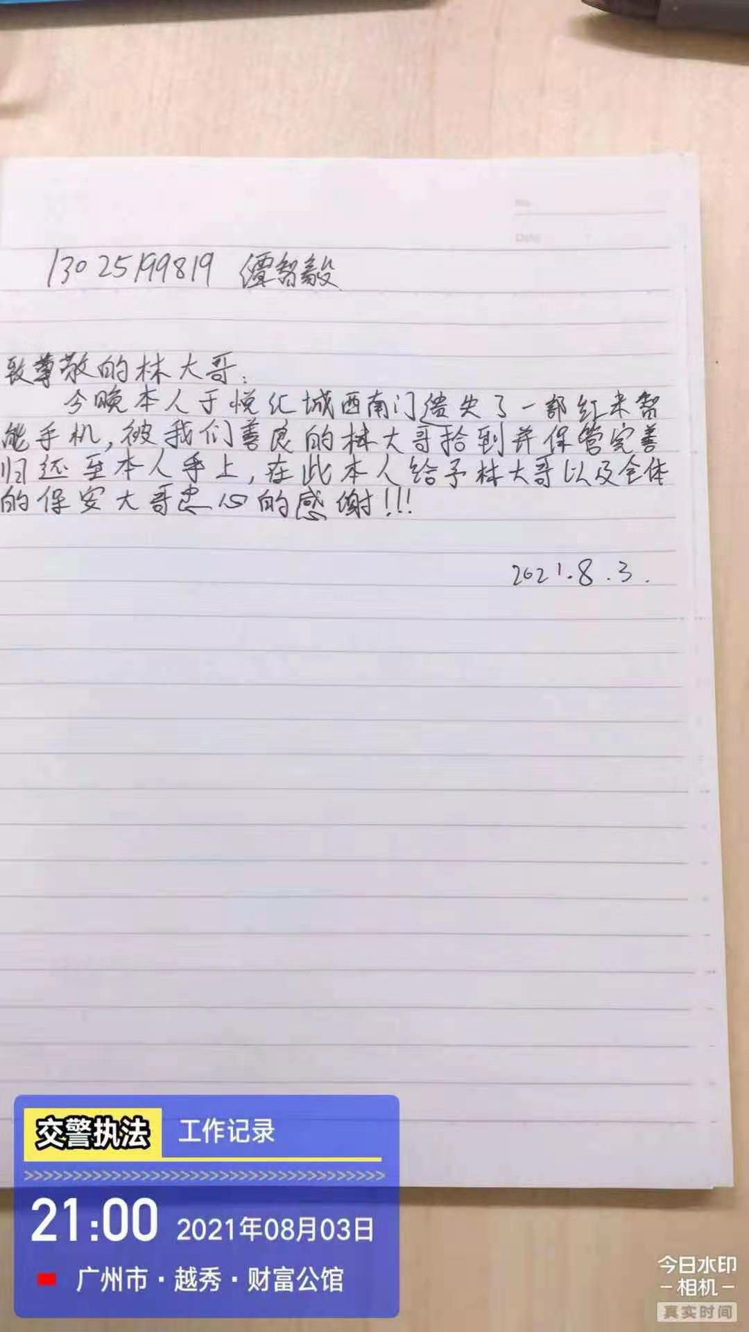 2021年8月3日,bet在线登录官网-bet(中国)驻西村悦汇城保安员林伟强像往常一样准备交接岗,当走至负一西南门门口的时候发现地上有一部黑色智能手机,林伟强在现场等待失主并上报了当班值班经理,不一会儿失主打电话过来,核实了失主身份后将失物归还。失主十分感动,并现场手写感谢信一封以表谢意。